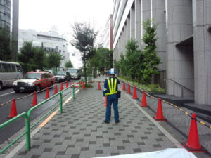 50歳くらいの男性が歩いて来たが、すでに車体が歩道をふさいでいたので「すみません、少々お待ちください」と手を伸ばして歩行者の進路を止めた。