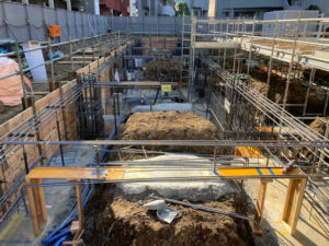 現在地中梁の配筋をしていて、週に一度くらい鉄筋材の搬入がある。